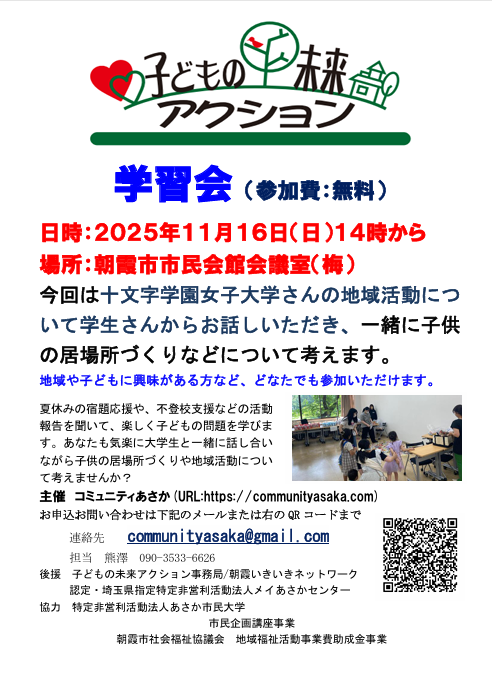 2025年11月16日子どもの未来アクション学習会を開催します。会場は朝霞市市民会館です。